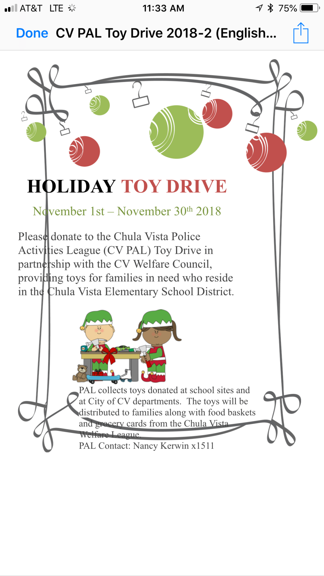 Chula Vista Police Toy Drive wolfcanyontimberwolvespta Uncategorized November 8, 2018 Share this: Click to share on X (Opens in new window) X Click to share on Facebook (Opens in new window) Facebook More Click to share on LinkedIn (Opens in new window) LinkedIn Like Loading... Related Published by wolfcanyontimberwolvespta View all posts by wolfcanyontimberwolvespta Published November 8, 2018