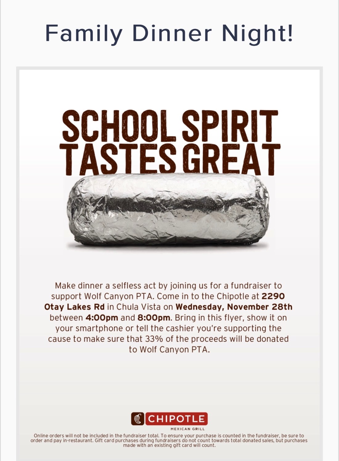 11/28 Chipotle PTA Fundraiser Family Dinner Night. wolfcanyontimberwolvespta Uncategorized November 18, 2018 Share this: Click to share on X (Opens in new window) X Click to share on Facebook (Opens in new window) Facebook More Click to share on LinkedIn (Opens in new window) LinkedIn Like Loading... Related Published by wolfcanyontimberwolvespta View all posts by wolfcanyontimberwolvespta Published November 18, 2018