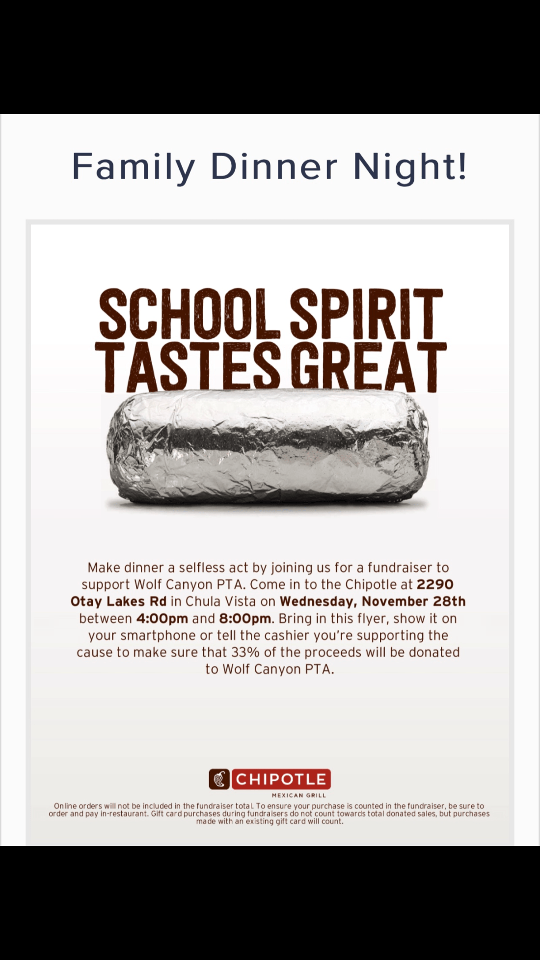 Come join us for dinner to help Wolf Canyon wolfcanyontimberwolvespta Uncategorized November 28, 2018 Share this: Click to share on X (Opens in new window) X Click to share on Facebook (Opens in new window) Facebook More Click to share on LinkedIn (Opens in new window) LinkedIn Like Loading... Related Published by wolfcanyontimberwolvespta View all posts by wolfcanyontimberwolvespta Published November 28, 2018
