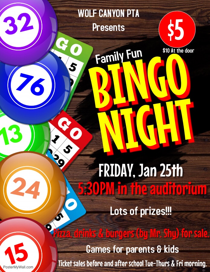 Bingo Night pre-sales $5 before and after school until Friday morning wolfcanyontimberwolvespta Uncategorized January 23, 2019 Share this: Click to share on X (Opens in new window) X Click to share on Facebook (Opens in new window) Facebook More Click to share on LinkedIn (Opens in new window) LinkedIn Like Loading... Related Published by wolfcanyontimberwolvespta View all posts by wolfcanyontimberwolvespta Published January 23, 2019