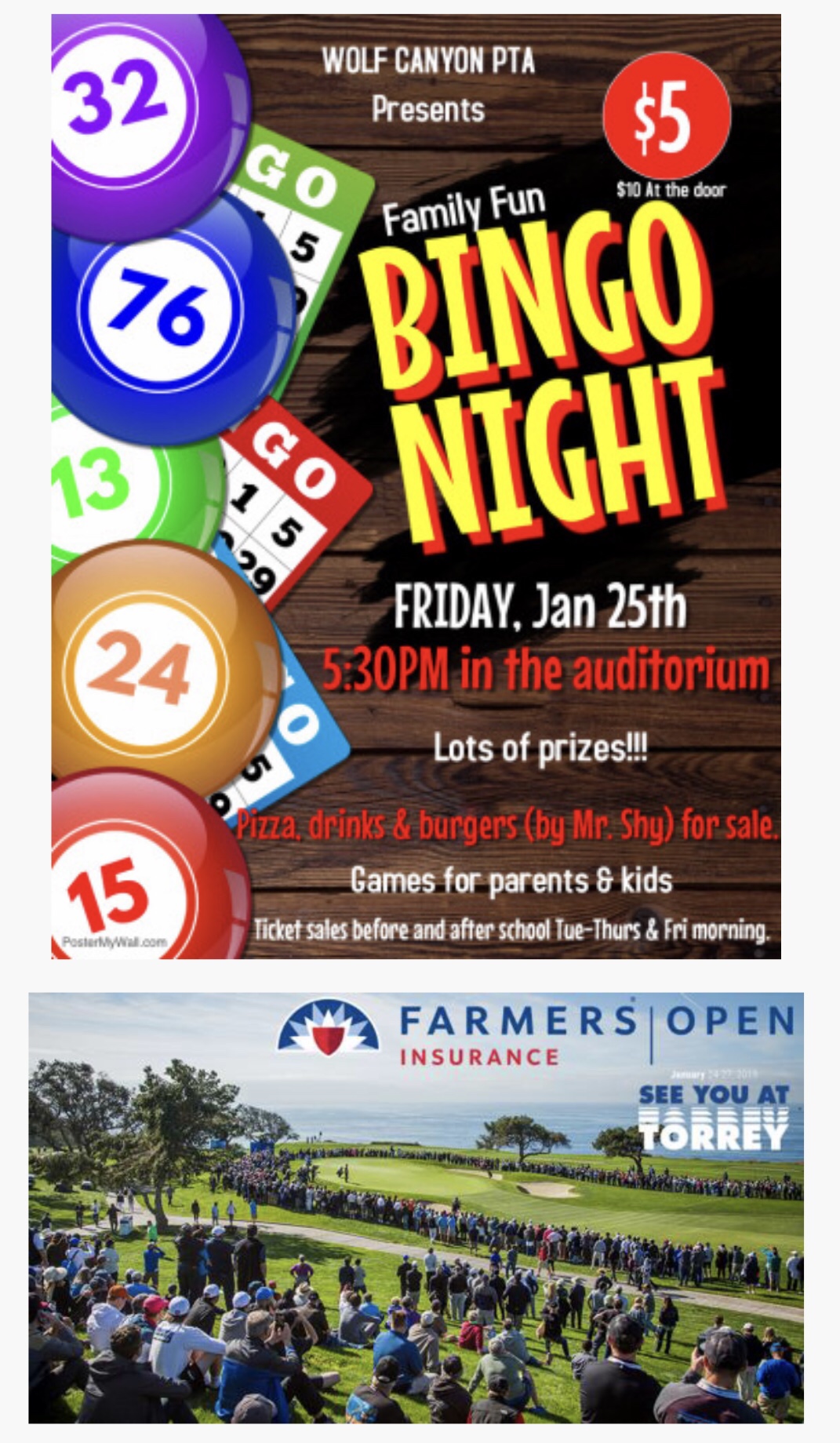 Wolf Canyon Bingo Night is this Friday and we have a lot of awesome prizes! Proceeds benefit the school. We hope you will join us. $5 a packet before school or $10 a packet at the door Friday night. We have pizza and burgers for sale too.
