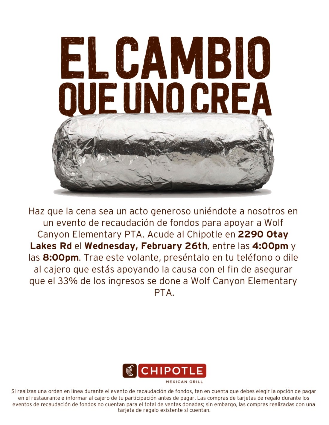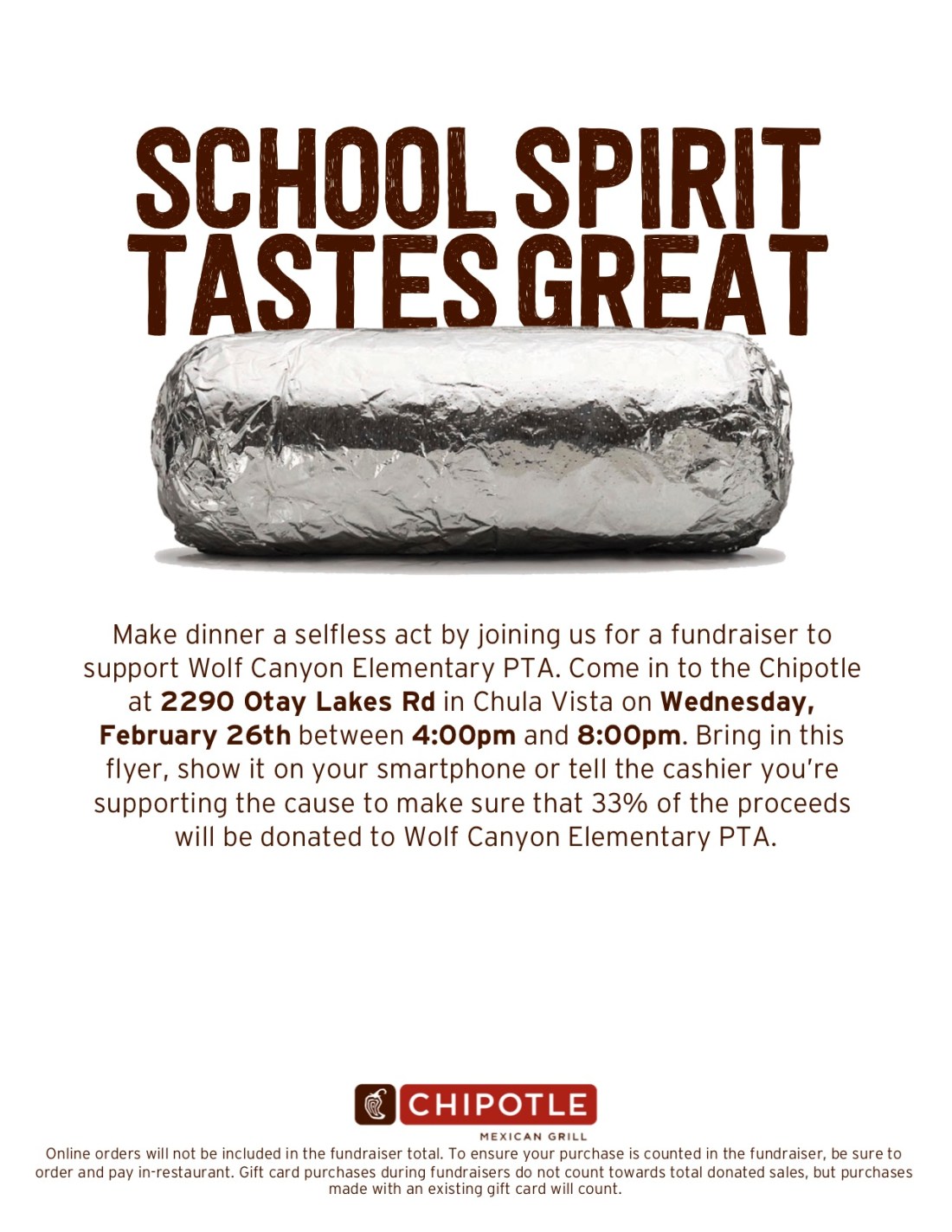 Please join us at Chipotle’s (2290 Otay Lakes, see below) on Wednesday, February 26 from 4:00 pm to 8:00 pm. Bring a paper or digital flyer (provided below).