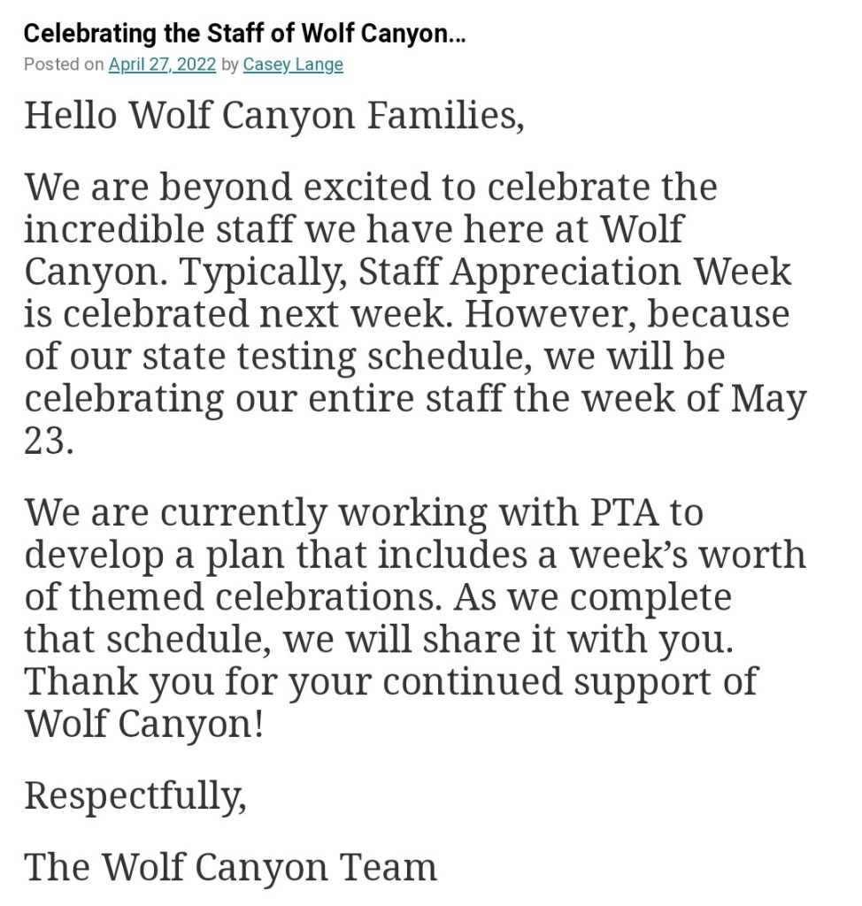 Staff Appreciation Week at Wolf Canyon: May 23rd-27th! wolfcanyontimberwolvespta Uncategorized April 28, 2022April 28, 2022 Share this: Click to share on X (Opens in new window) X Click to share on Facebook (Opens in new window) Facebook More Click to share on LinkedIn (Opens in new window) LinkedIn Like Loading... Related Published by wolfcanyontimberwolvespta View all posts by wolfcanyontimberwolvespta Published April 28, 2022April 28, 2022