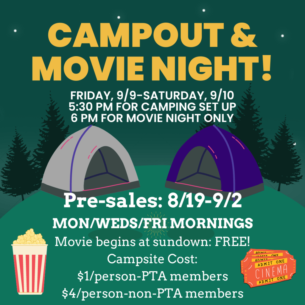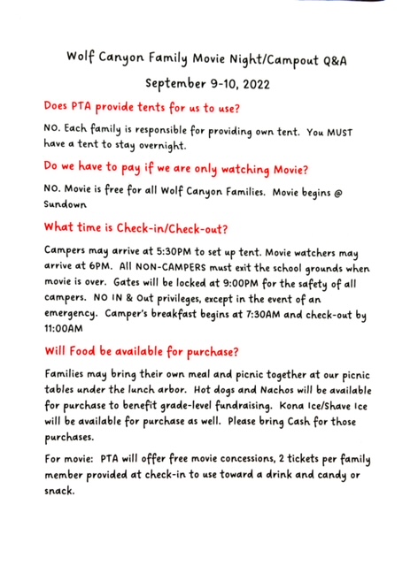 Dust off your tents & find those sleeping bags…our annual Campout & Movie Night at Wolf Canyon is coming back! Save the date for Friday, 9/9-Saturday 9/10 and make plans to join us on campus as it transforms into a fun overnight adventure! Movie Night begins at sundown on Friday & is free and open to all families. Overnight campsites are available by reservation only, so make sure to sign up early! PTA members can save on their site price, so join today! https://jointotem.com/ca/chula-vista/wolf-canyon-elementary-pta
