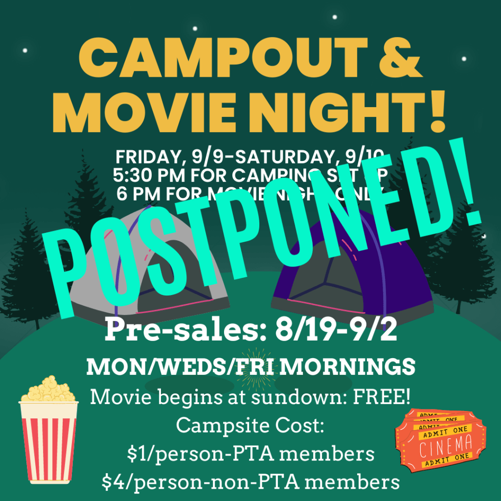 We are sad to announce that PTA will be postponing Movie Night and Campout due to rain in the forecast beginning Friday, 9/9 and into Saturday, 9/10. Our plan is to move forward on October 21, 2022! We are sorry for the inconvenience but we are looking forward to sharing this fun night with you very soon. We will keep everyone informed as the date gets closer.