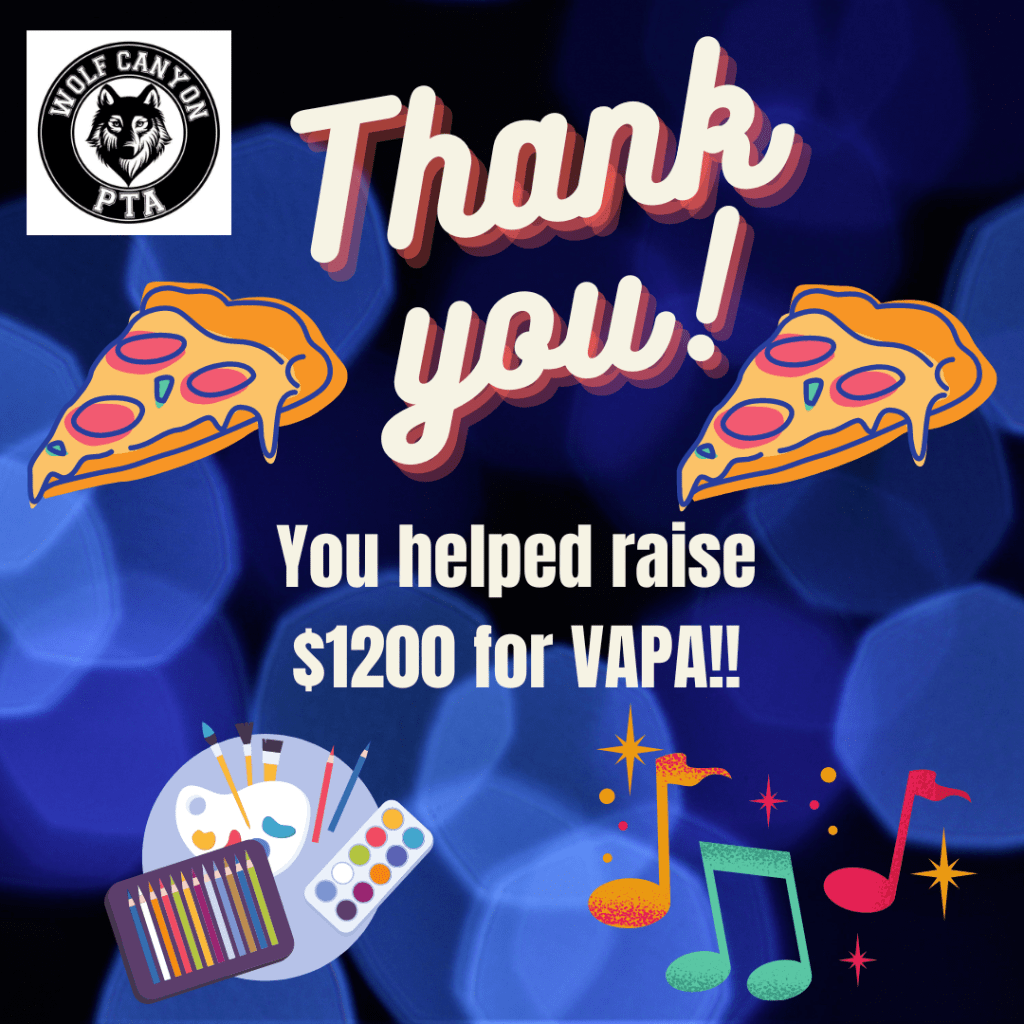We exceeded our expectations for our Fun Run, which is our biggest fundraiser of the year, and are excited for all that PTA will be able to do for our teachers and students with the money raised. Also, our Family Dinner Night at Blaze Pizza last week showed that 1) Timberwolves LOVE pizza & 2) We truly value our VAPA program at Wolf Canyon. Thanks to all of you coming out & spreading the word, we raised more than enough for both our Art & Music departments! Awwwwooooo!