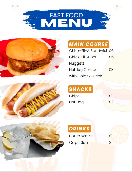 Dinner (Chick-Fil-A, hot dogs, & more) will be available for purchase (Cash-only)