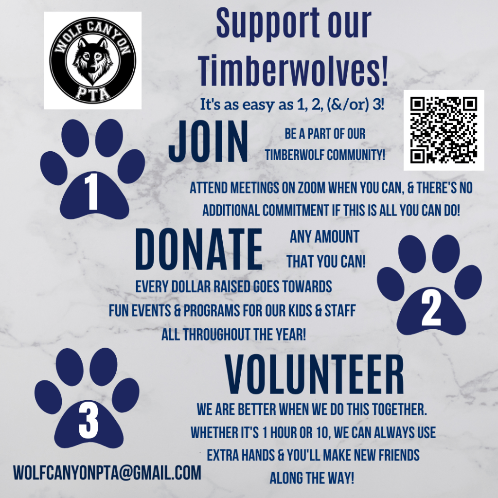 We appreciate any and all types of support to help make this a fun and memorable year! If you have any questions, or would like to help anytime this year, please email: wolfcanyonpta@gmail.com