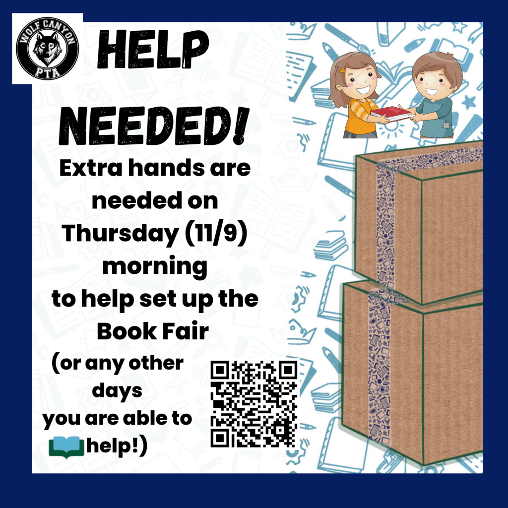 Our Fall Book Fair is just around the corner on 11/13-17. Help is needed to set-up on Thursday (11/9) morning in the Library, or if you are available any day next week after-school, we’d greatly appreciate it! Please sign up here: