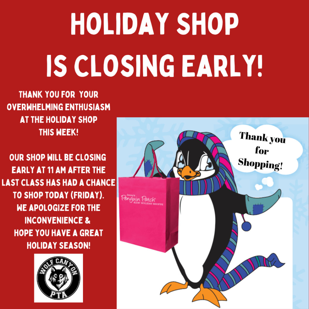 Due to a lack of volunteers and low merchandise, we will be closing the Holiday Shop at 11 AM today after our last scheduled classes have had a chance to shop. We apologize for the inconvenience and are grateful for the enthusiasm of our Timberwolves in shopping. Happy Holidays!