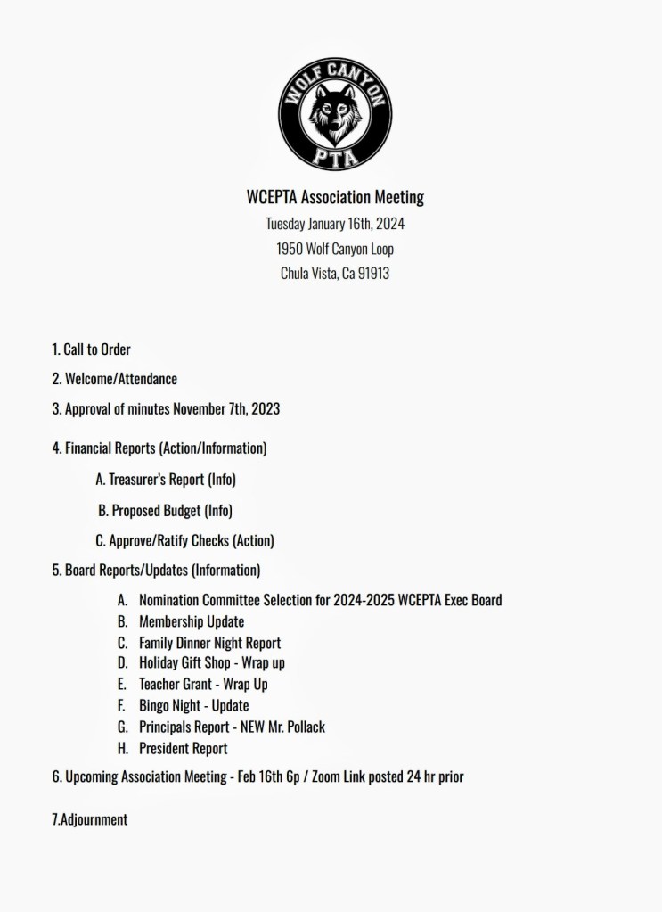 This is an important meeting as we will be forming the nominating committee for the 2024-25 Executive Board. All members are strongly urged to attend. Please plan to join us to help make a difference for your Timberwolves, and also welcome our new Principal, Mr. Pollack!