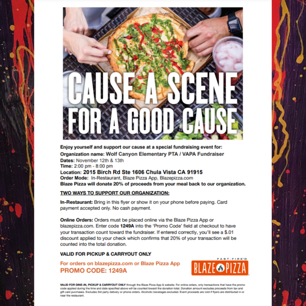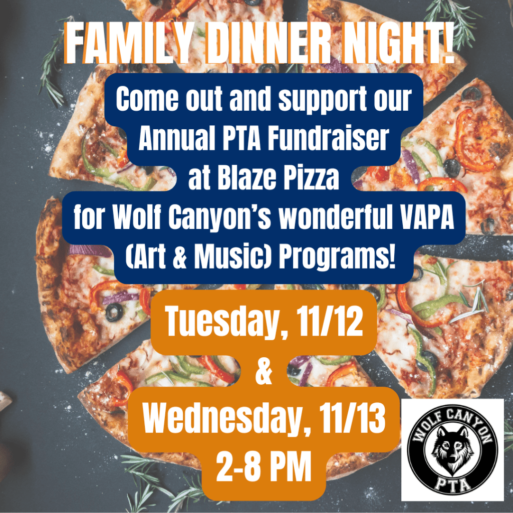 Skip the cooking and come on out to Blaze Pizza on Tuesday, 11/12 & Wednesday, 11/13 to eat some delicious pizza to support our VAPA programs! Please mention Wolf Canyon Elementary and code 1249A when ordering.
