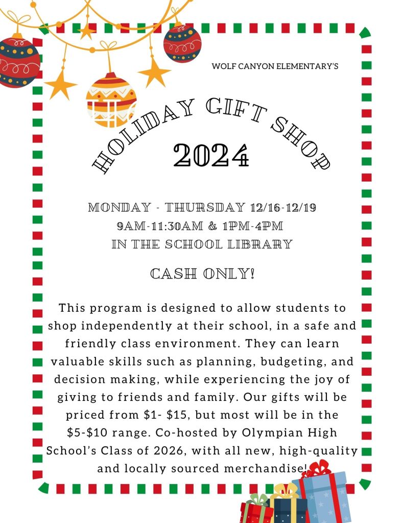 Our Holiday Gift Shop will be on campus Monday, 12/16- Thursday, 12/19! Timberwolves will get the chance to shop for family & friends from this year’s unique shop co-hosted by Olympian High School’s class of 2026. Be sure to stop by after school and sign up to volunteer if you’re available to help us make this a fun week! https://www.signupgenius.com/go/4090A45A9AD2BA2F94-53947595-holiday#/