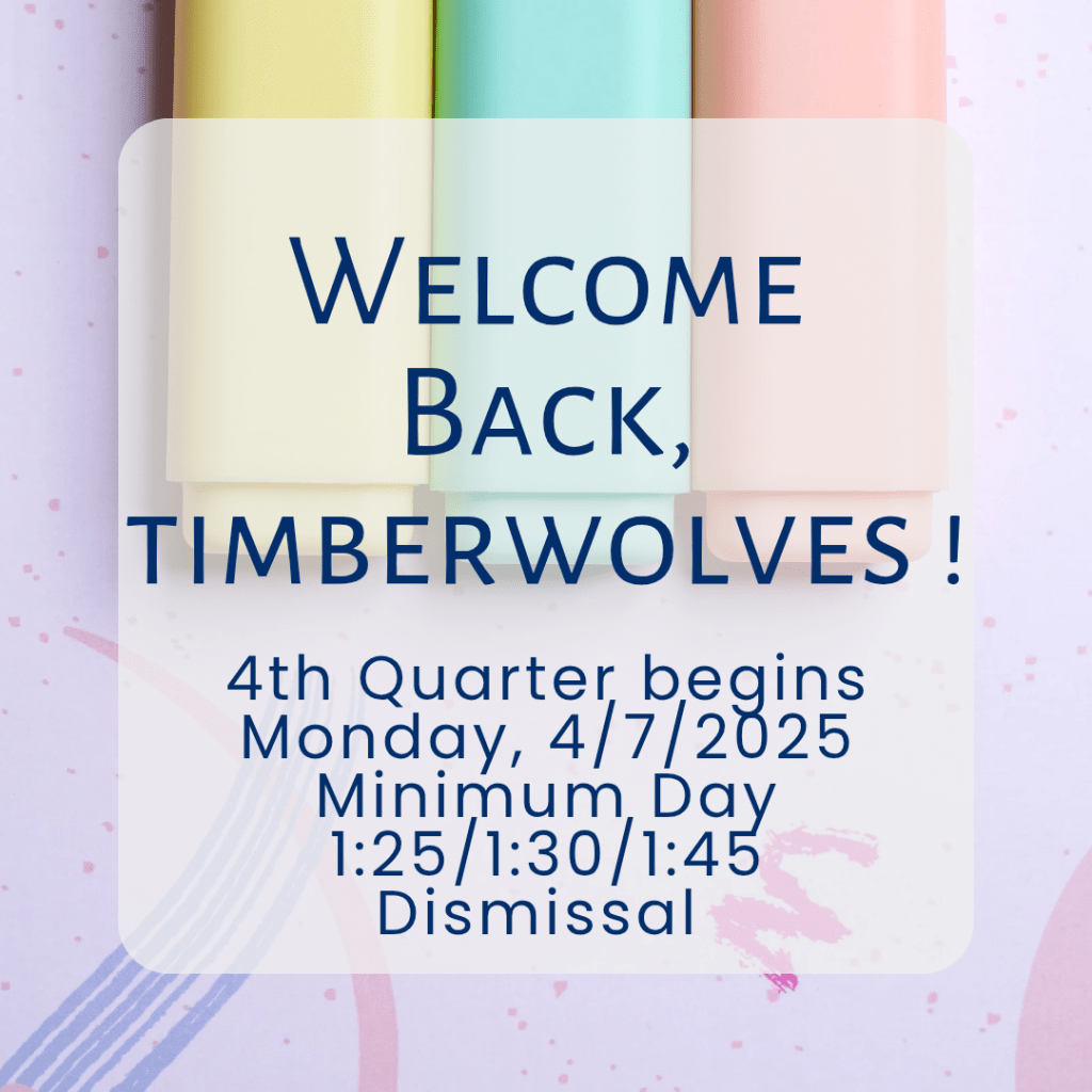 Welcome back, Timberwolves! We have a busy 4th Quarter ahead of us! Be sure to mark your calendars for all of our upcoming events so you don’t miss out. See you on Monday (Minimum day)!