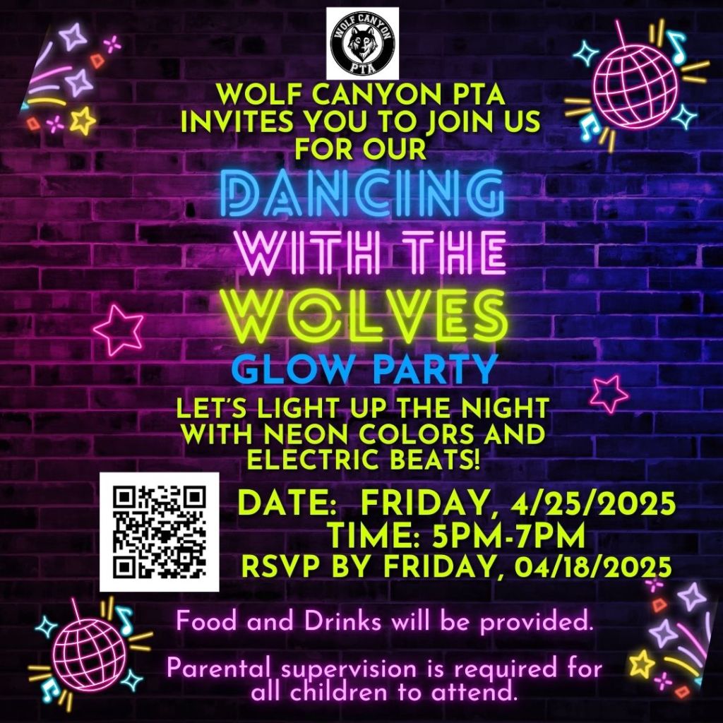 We invite you to join us for Wolf Canyon PTA’s Dances with Wolves on Friday, 4/25 from 5-7 PM in the MPR! All attendees must be accompanied by a parent/adult guardian. Please RSVP by Friday, 4/18 here: https://forms.gle/djrDiXoXeiYomRHs9 See you there!