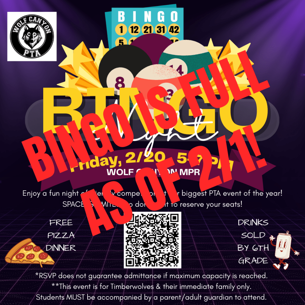 AS OF Sunday, 2/1, BINGO Night is FULL! We are at max capacity. If you RSVP’d on 2/1 or later, please check your emails tonight to see if you have been waitlisted. We will reach out should any cancellations open up seats. THANK YOU!