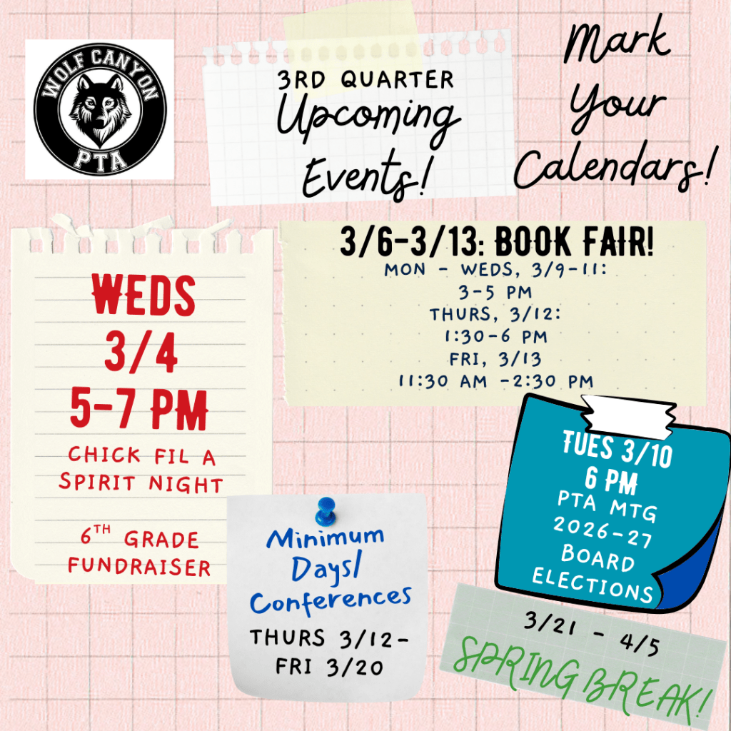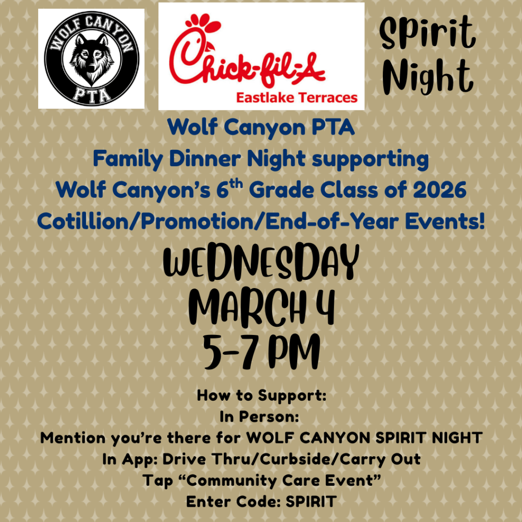 There’s only a few weeks left in the quarter, and we have so many fun events coming up! Be sure to mark your calendars and make plans to join us! Our first event will be our Family Dinner Night at Chick-Fil-A to support our 6th Grade Class of 2026 next Wednesday, 3/4. We hope you’ll join us for dinner, along with all the other events before we go on Spring Break!