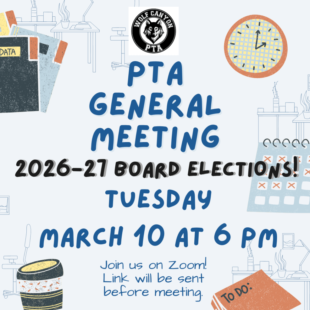 Please join us for a very important meeting this Tuesday, 3/10 at 6 PM as we elect our new 2026-27 PTA Board! It is vital that we have quorum, and we encourage you to come support the future of YOUR PTA! Register to join and get a reminder for the meeting here: https://us02web.zoom.us/meeting/register/5tyFx7I_SCWNp1KWcaqiQA