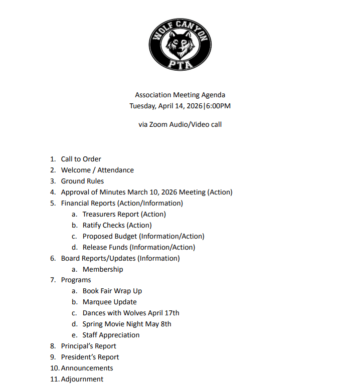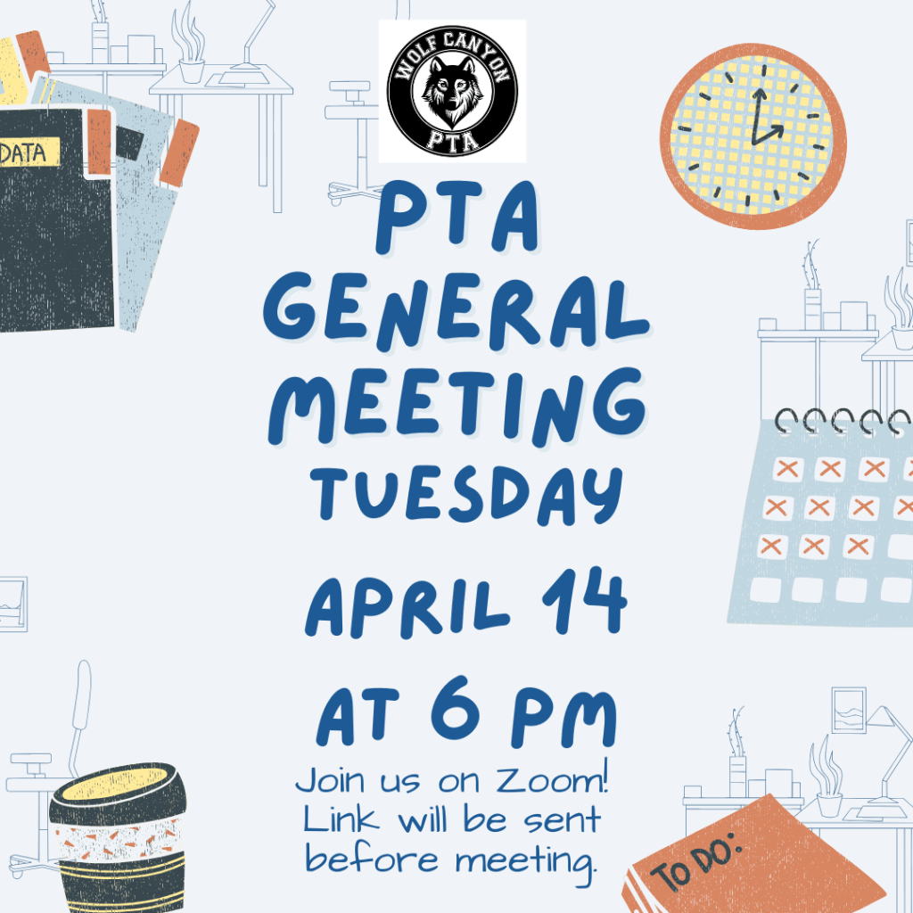 PTA General Meeting: Tuesday, 4/14 at 6 PM! wolfcanyontimberwolvespta Uncategorized April 12, 2026April 10, 2026 Share this: Share on X (Opens in new window) X Share on Facebook (Opens in new window) Facebook More Share on LinkedIn (Opens in new window) LinkedIn Like Loading... Related Published by wolfcanyontimberwolvespta View all posts by wolfcanyontimberwolvespta Published April 12, 2026April 10, 2026